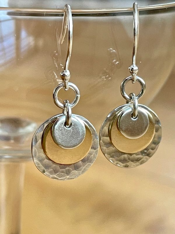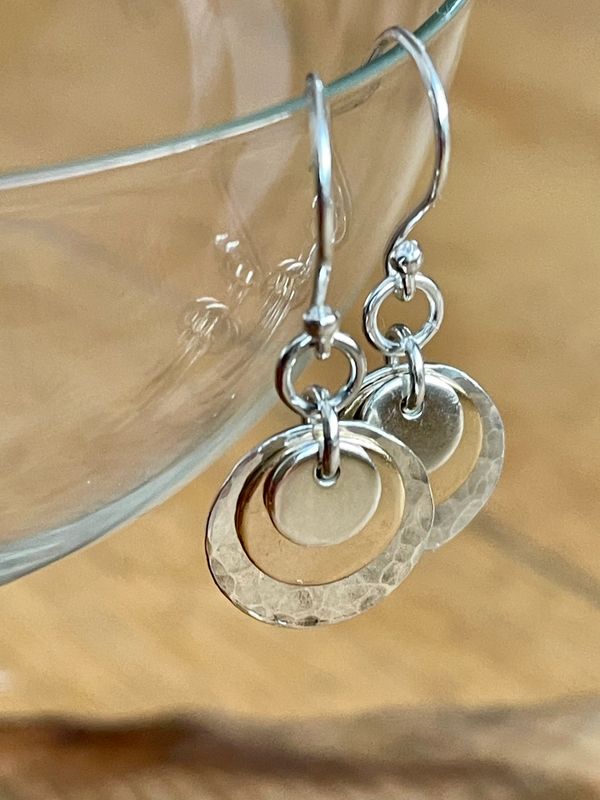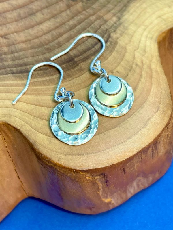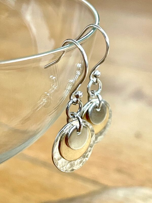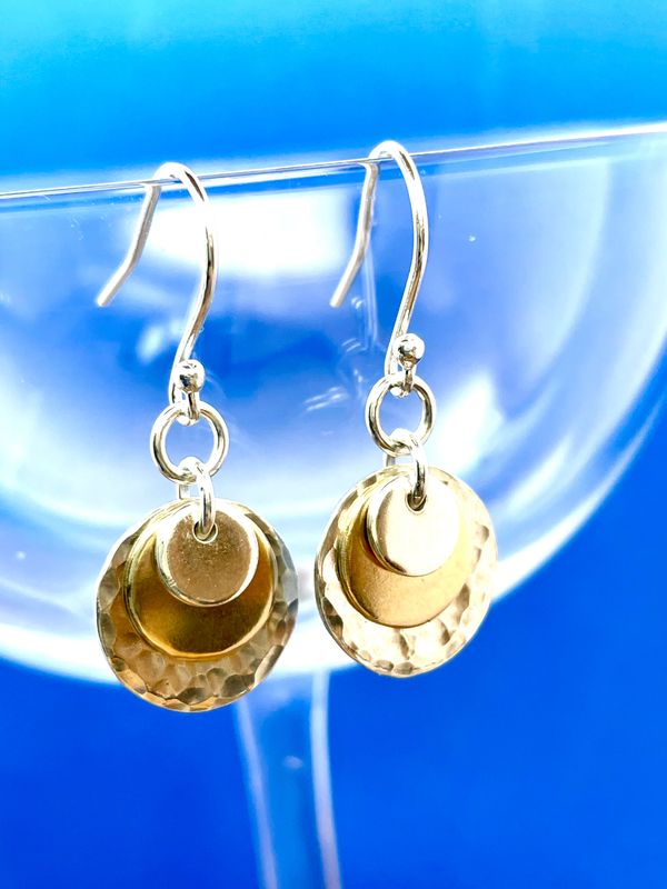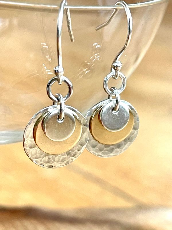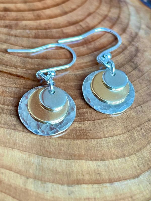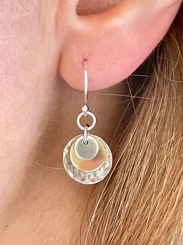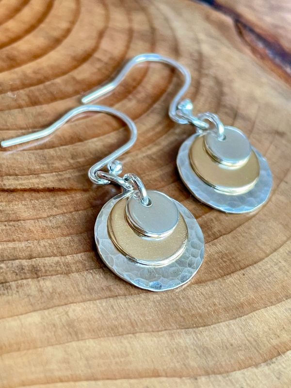 These simple diminishing discs in 9ct gold and recycled sterling silver create a very pleasing effect with lots of movement which catch the light.